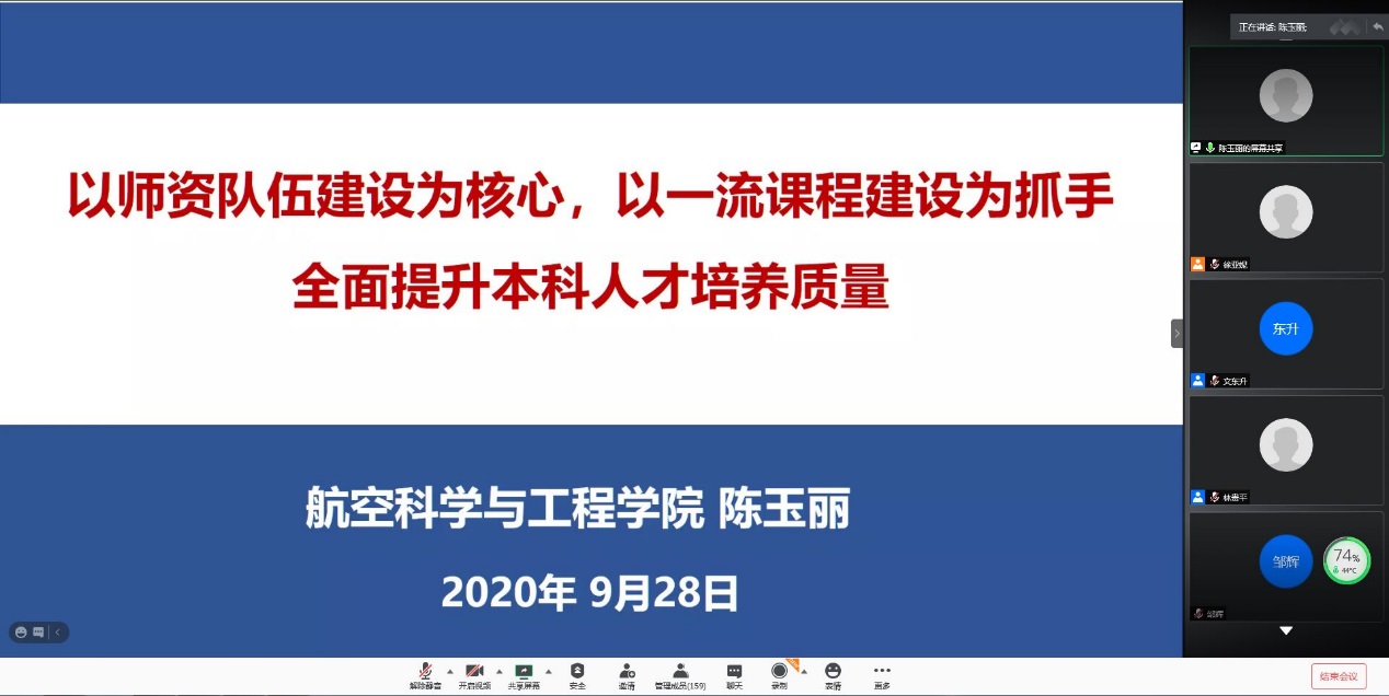副院长陈玉丽做了题为《以师资队伍建设为核心,以一流课程建设为抓手 全面提升本科人才培养质量》的报告。主要汇报了人才培养理念和方式的变化、全面提升人才培养质量和本学年重点工作三方面内容。她指出培养模式从专业型人才培养向复合型人才培养转变,培养方式也要随之转变,概括起来就是要以学生为中心,从专业、课程、教师以及教学成果等多方面提升我院的人才培养能力。在师资队伍建设方面,继续施行“导师制”,促进青年教师快速成长。在课程建设方面,以一流本科课程建设为抓手,全面推动本科人才培养改革,计划用3年时间,建设四级一流本科课程。已申报国家级一流课程4门,今年拟申报4-5门;第一批立项校级一流课程8门,第二批申报了4门;院级一流课程立项10门,院级培育课程立项13门。在专业建设方面,飞行器设计与工程获批首批国家级一流本科专业建设点,工程力学专业获批首批国家级一流本科专业建设点、强基计划专业,计划申报拔尖计划2.0第二批,飞行器环境与生命保障工程专业正在申报国家级一流本科专业,新增飞行器控制与信息工程专业。陈院长提到,今年本科教学的重点工作主要包括一流课程建设、课程思政、一流专业建设、一流基地建设,继续探索面向未来的创新拔尖人才培养模式。