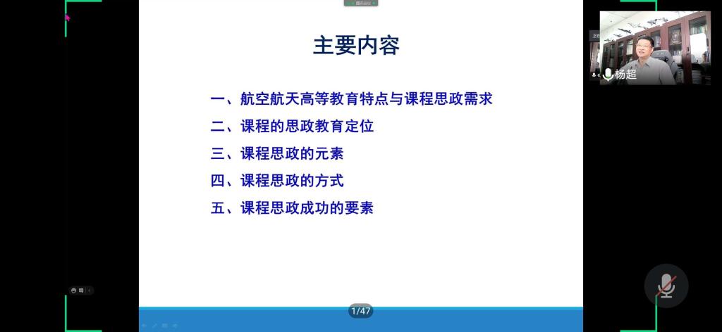 会上,学院特别邀请杨超教授为全院老师做了课程思政建设的专题报告。杨老师结合航空航天高等教育的特点与课程思政的需求,从课程思政的定位、元素、方式和成功要素几方面分享了自己的经验。杨老师提出课程思政应包含“爱国奉献”、“思辨创新”、“职业道德”等元素,由点及面、由分散到系统,还强调教师的“四有”是课程思政成功的前提,只有教师真心、细心、上心,通过润物无声、潜移默化的方式将思政元素融入课程,与知识能力相融合,才能做好课程思政,培养出德才兼备的两领人才。