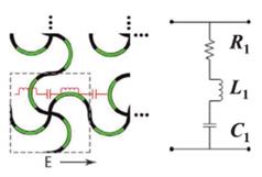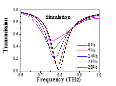 太赫兹时域光谱实验结果表明, 可拉伸超表面具有带阻频率选择特性,在施加28%的外部拉伸应变时,谐振频率的太赫兹波传输率可从0.15调到0.5,而频移只有3.4%。通过相应的电磁仿真和提出的LC等效电路模型,讨论了超表面的频率选择调制机理。