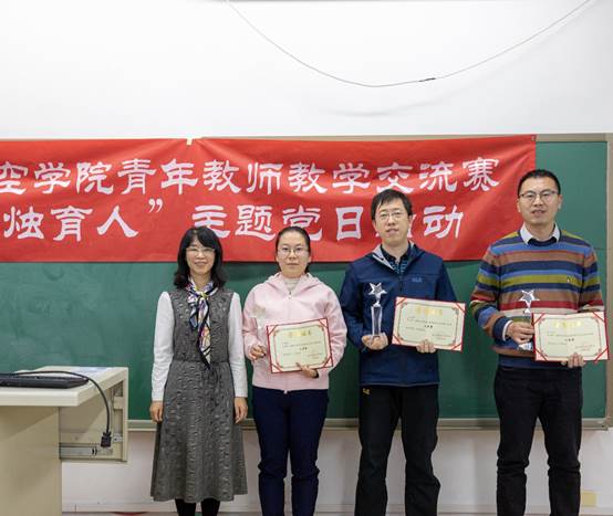 图10 2019年“立德树人卓越奖”获得者贾玉红老师为获得二等奖的3位青年教师:高振勋、郝宇清、宋磊颁奖。