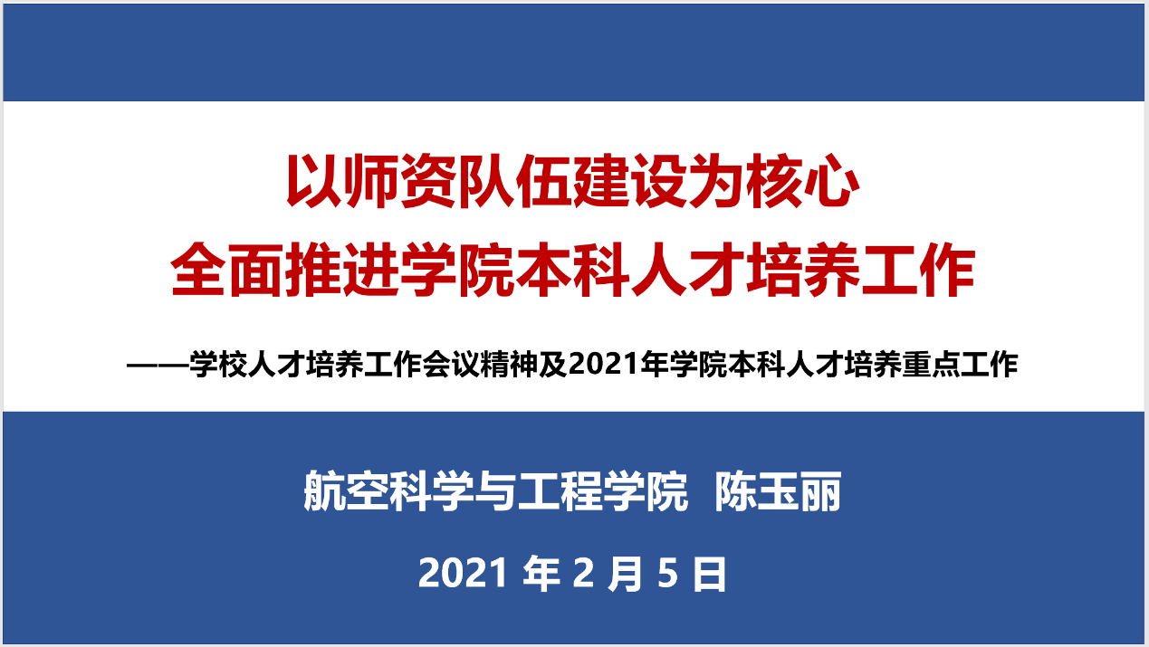 本科教学副院长陈玉丽做了题为《以师资队伍建设为核心,全面推进学院本科人才培养工作》的报告,主要回顾了学校人才培养工作会议精神,重点汇报了2021年学院本科人才培养重点工作。陈院长强调,通过“对标、传承、再塑”,构建北航高质量人才培养体系,其核心是五育并举、三全育人,全员全过程全方位培养一流人才。陈院长从专业、师资、课程、教材、质量保障等五方面对本年度人才培养重点工作做了汇报,对我院专业和课程现状进行了梳理,提出建设高水平师资队伍、打造高质量课程和高水平教材等多项举措,指出2021年要落实课程思政全覆盖、一流本科课程建设、毕设质量管理、新版培养方案修订等重点工作。
