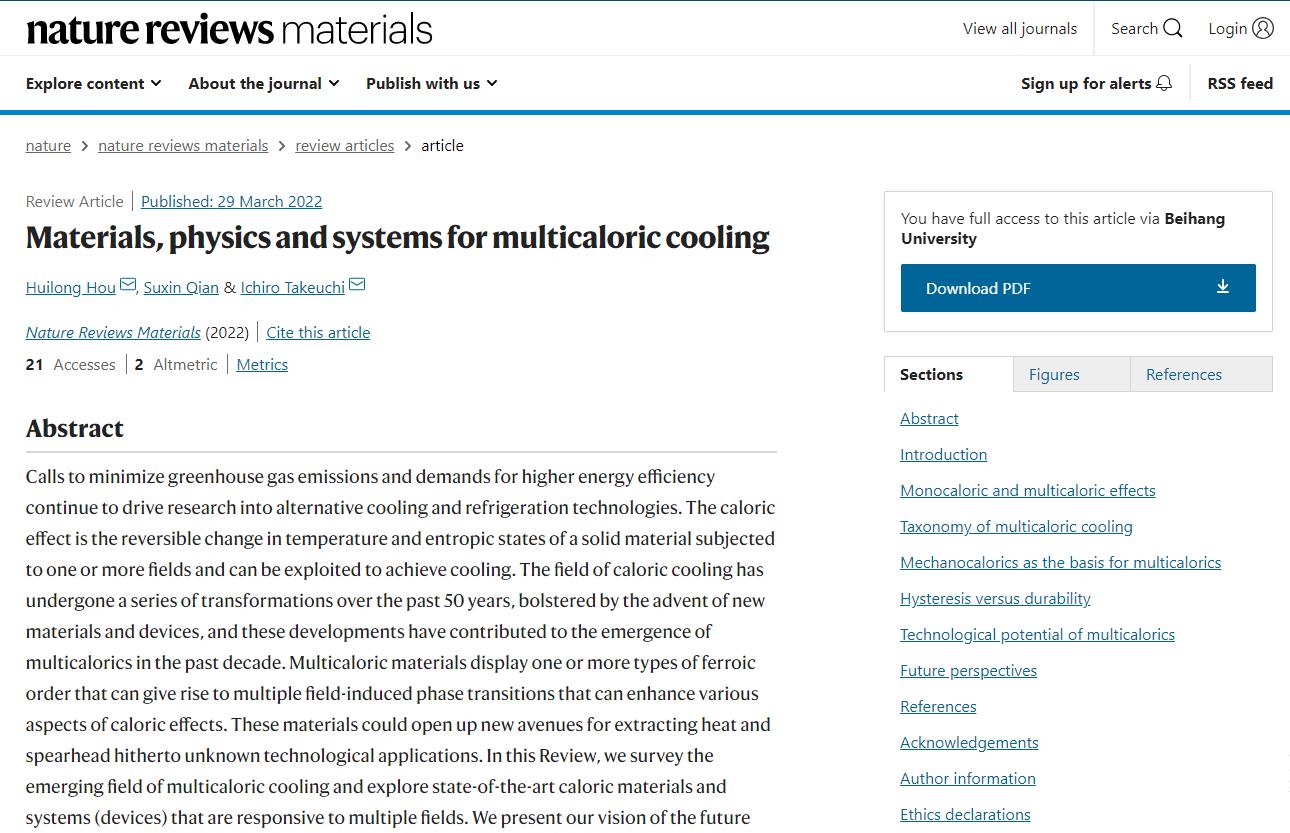 侯慧龙副教授在固态相变制冷领域取得的新进展:《Materials, physics and systems for multicaloric cooling》(//www.nature.com/articles/s41578-022-00428-x)。固态相变制冷技术,基于固体材料内禀序参量在外场源下的可逆改变引起材料的吸/放热效应,经热力学循环实现制冷,具有绿色环保、节能高效、低噪稳定等诸多优点,不仅具有巨大的市场经济价值与社会环保意义,而且在航空航天、空间探测等领域也具有重要应用前景。此工作在梳理和归纳了单场以及多场转换与调控固态相变制冷技术的基础上,从材料、物理、系统三个层次进行了原创性的研究工作,实现了场致熵变的联合增效,建立了相变制冷材料的延寿准则,完善了多场功-能转换器件的评价体系。该工作不仅是对单场致效应的归纳与补充,而且丰富和拓宽了多场作用下制冷材料与器件的种类及概念范畴。值得一提的是,所发表期刊《Nature Reviews Materials》的影响因子(IF=66.308),在全球物质类(材料、化学、物理、工程、机械等)研究期刊中,排名第一。该项工作也是北航自建校以来发表在该期刊上的第二篇成果(第一篇由江雷院士于2017年发表)。