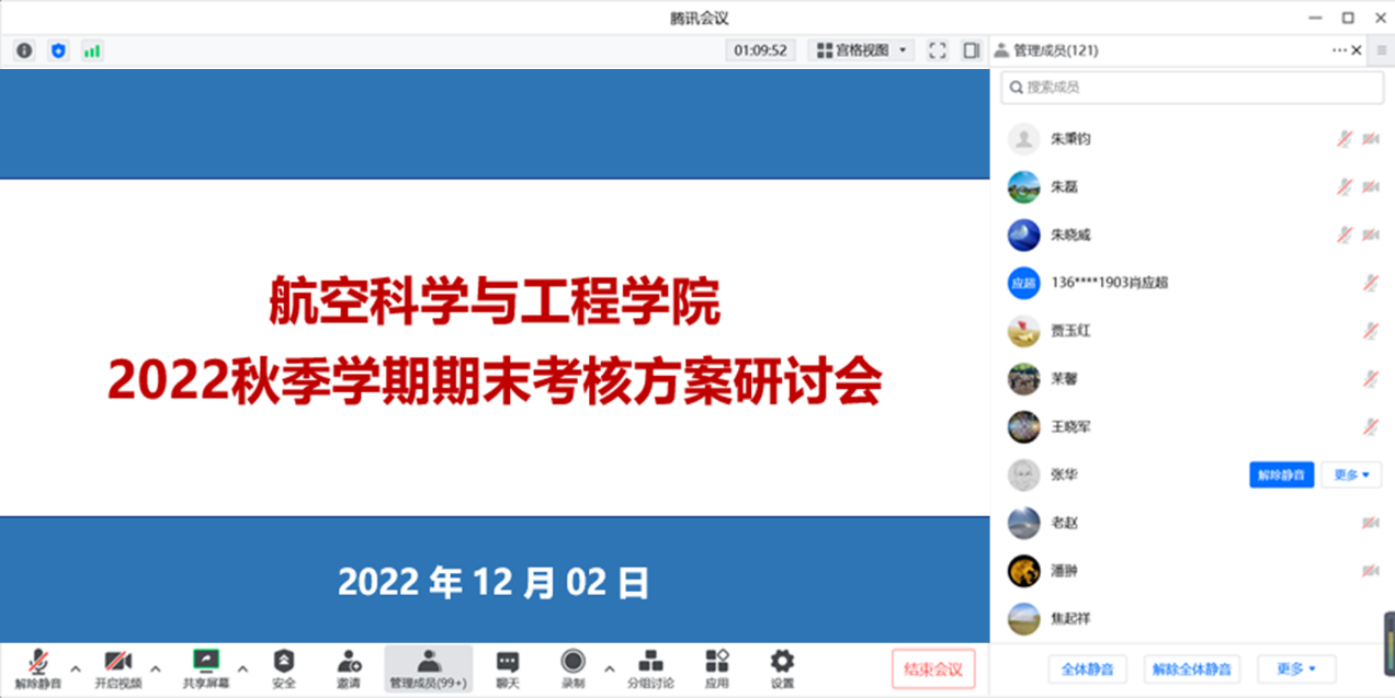 随后,“材料力学”和“空气动力学”课程分享了组织线上考试的经验,针对考试流程以及注意事项进行了充分的讲解和说明。接着,“理论力学”、“航空航天概论”等11门核心课程进行了线上期末考试方案的汇报,学院教学指导委员会及教育督导组专家对课程的考核方案进行了审核并提出了详实的建议。