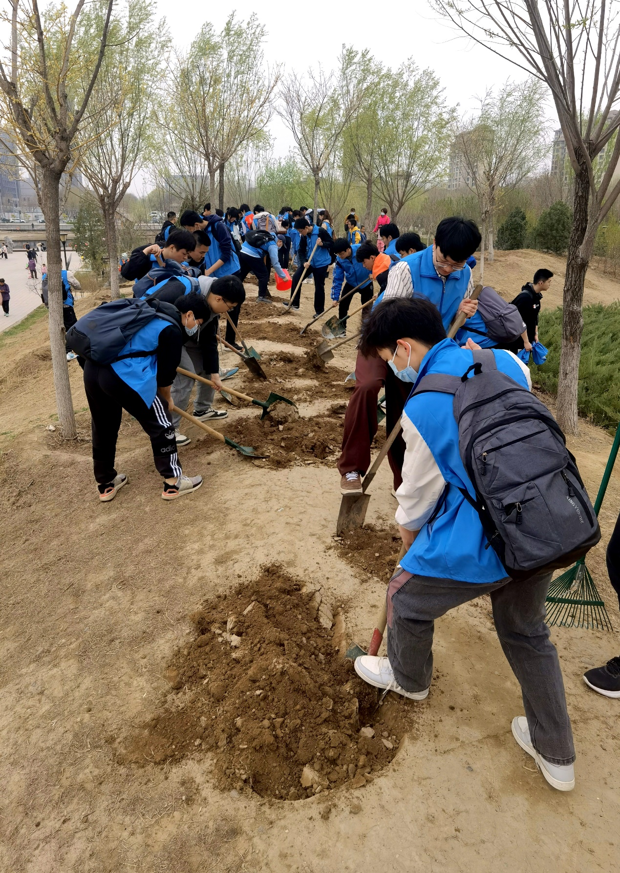 春分新过,山色渐青,正是播种育苗的大好时光。学院一行40余名学生在公园管理员老师的指导下,逐渐领会了“挖-翻-填-踩-浇”的种树育花技巧。同学们不顾飞扬的尘土,不嫌深埋的垃圾,不感劳作的疲惫,或扶铲来回于树坑,或携袋奔波于各处,或提桶浇筑于林地,汗水簌簌流淌,同学们没有丝毫的怨言,在一番辛勤劳作之下,一棵棵小树苗亭亭直立,一颗颗花种洒落大地,相信来年的春天,它们一定会为这片土地增添一份可喜的新绿与五彩的斑斓。植树育花的过程,也是育人成长的过程,“十年树木,百年树人”,航空学子也将如同新种的植株一般,向阳而生,迎风而行,彰显新时代青年昂扬的生命力量。
