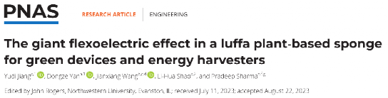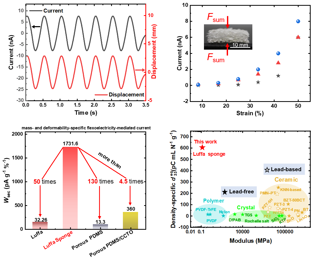 近日,该课题组发现了天然多孔材料—植物丝瓜络的巨挠曲电效应,建立了力-电耦合模型,揭示了其力-电耦合机制,实现了具有最高比密度等效压电系数的优异性能,展示了这种天然生物材料作为绿色环保的柔性发电机及其他智能器件的应用实例和前景。