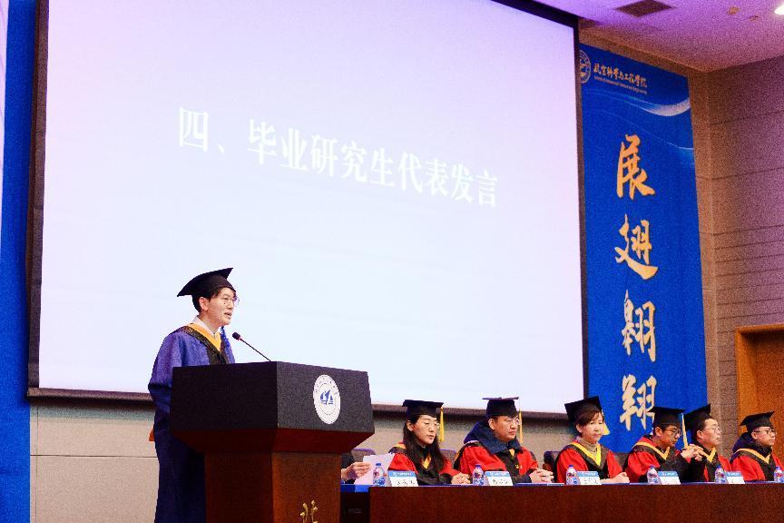 三年的求学经历,讲述了自己在北航学习生活的收获体会,通过科学研究体会追求真理的乐趣,通过科技竞赛领悟实践出真知,在空天文化的浸润下心系国家、勇担时代重任。他感谢了学院和导师对自己的培养和帮助,并鼓励所有毕业生同学要勇于引领、勇于创新,做祖国航空航天事业的推动者,在新的人生征途上传承弘扬以空天报国为内核的北航精神,牢记使命,奋勇拼搏,再创佳绩,为国家航空事业发展做出应有贡献。