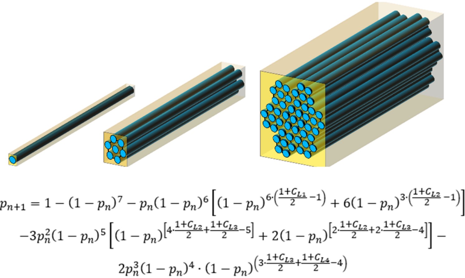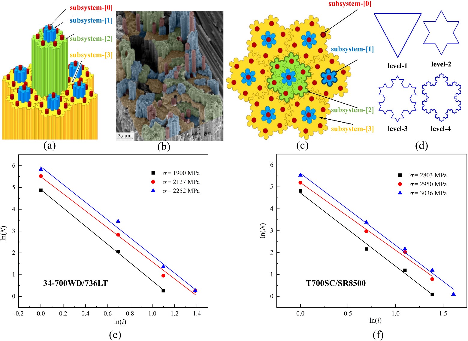 针对上述问题,研究团队首先对复合材料在拉伸过程中的失效机制进行了深入研究,发现纤维增强复合材料在拉伸断裂时呈现出准分形的特征。其次,研究团队对拉伸失效前复合材料中的断裂纤维进行了统计分析,发现断裂纤维簇的尺寸与数量之间存在幂律关系。这种分形特征和幂律关系是自组织临界性耗散系统的典型特征。因此,研究团队首次将自组织临界性理论引入复合材料的拉伸失效分析中,认为不同尺度下复合材料的拉伸失效行为存在相关性,即具有尺度不变性。据此,团队采用重整化群方法建立了复合材料拉伸失效的尺度缩放律,从而能够给出不同尺寸的单向纤维增强复合材料的强度分布。