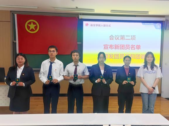入团仪式在庄严的国歌声中拉开帷幕。与会人员全体起立,齐唱国歌。经团组织培养考察,2024年春季学期,薛天宇、蒋研、杨星婷、张睿博和邹清阳五名同志光荣地成为了中国共产主义青年团的一员。在庄严的入团仪式上,辅导员刘丽娜为五位新团员佩戴团徽,标志着他们正式成为光荣的共青团员。优秀团员代表黄紫琦带领新团员宣誓,全体新老团员高举右拳,以饱满的精神面貌向团组织坚定表明为共产主义事业而奋斗的理想信念。