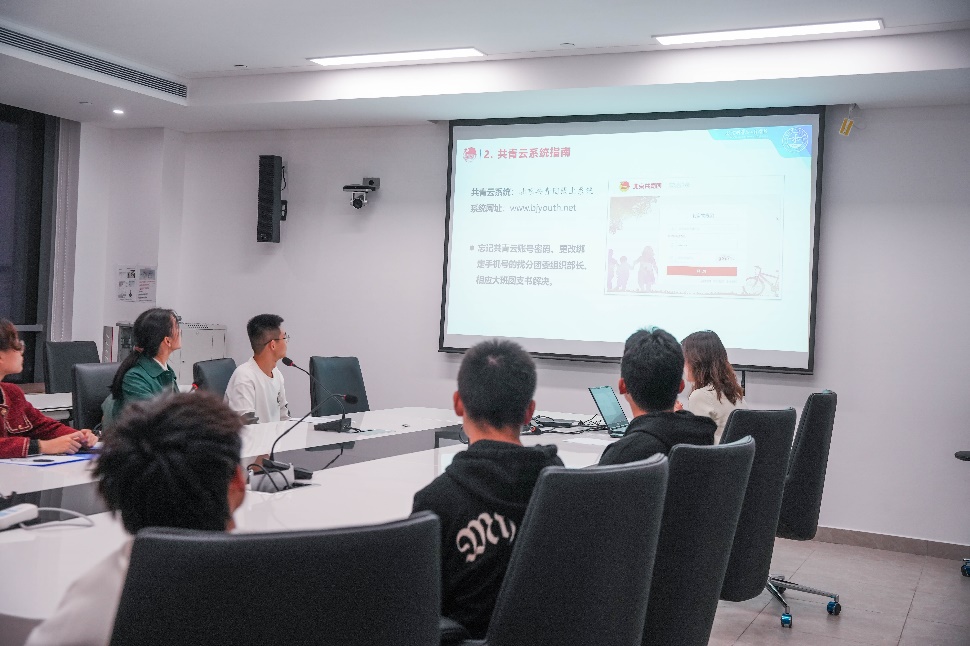 随后,刘丽娜从分团委、大班团支书、小班团支书、监督检查机制四个方面介绍了团学组织的工作体系,并就如何通过共青云系统进行团关系的转移和活动录入进行了现场培训。