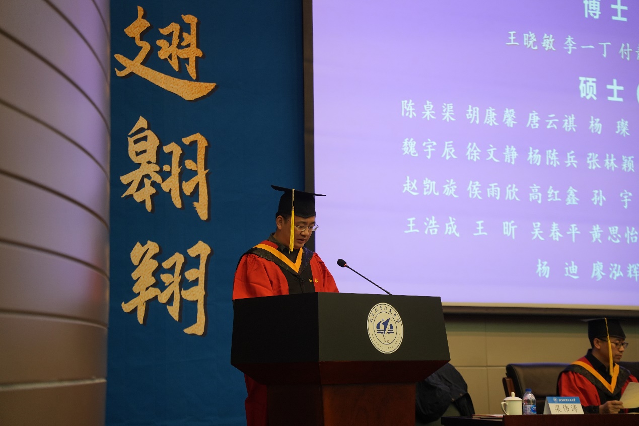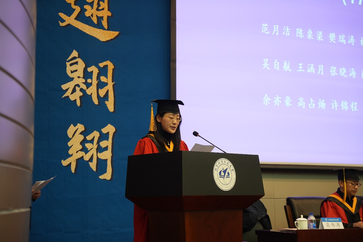 的求学经历,“研究生阶段不仅让我们获得了学术上的进步,也赋予了我们更多的社会责任。无论将来我们从事什么职业,进入什么行业,我们都将以知识为武器,以责任为动力,服务社会、回馈社会。”她感谢了学院和导师的培养以及亲人朋友们的支持陪伴,并鼓励所有毕业生同学:“我们曾一起在这里追求梦想,曾一起在这里付出努力,曾一起在这里成长。”祝愿大家在新的征途上,以更加饱满的热情,迎接更加辉煌的明天。