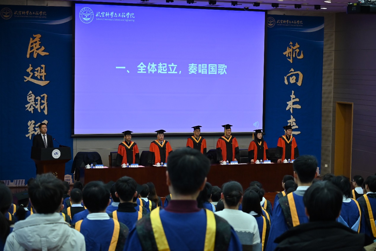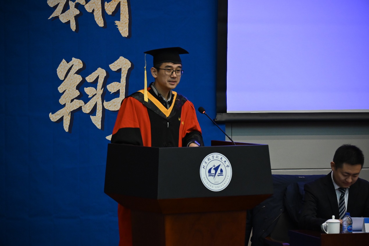 院长潘翀代表学院祝贺同学们顺利毕业,并寄语2025届毕业生,期待大家远走高飞,一飞冲天。对于未来的人生航程,潘院长提出三点期望,激励2025届研究生毕业生。一是要胸怀梦想。潘院长分析了近期的国际形势并指出,只有拥有强大的空天国防力量才能维持安定的社会局面,希望毕业生胸怀梦想,不论从事什么行业都不失去空天报国的理想本色。二是要坚定信念。潘院长分享了近期去扬州研究院的调研经历,以及校友的亲身经历,勉励毕业生坚定信念,在受到挫折时保持初心梦想,发扬北航人骨子里“不服输、不怕苦、不信邪”的精神。三是要放眼世界。面对目前的国际形势,要有国际视野,不懈努力、不断阅读,使我国的空天技术早日达到世界领先水平。