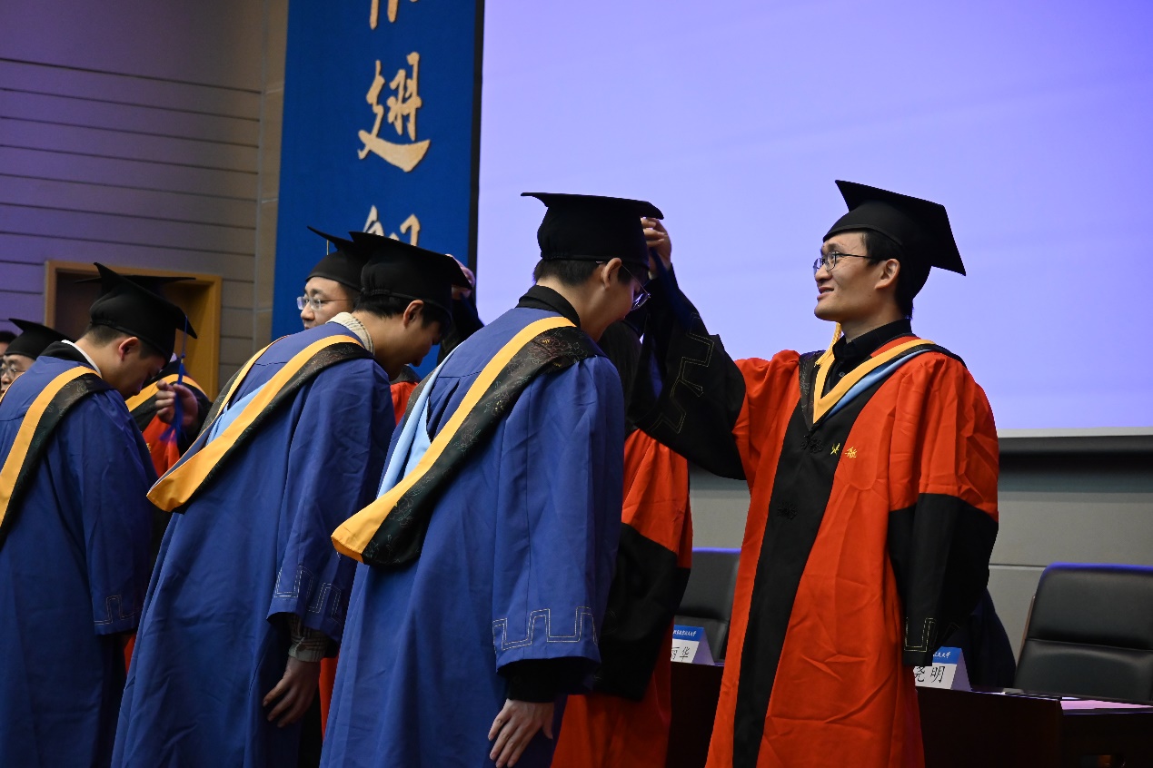 毕业典礼结束后,进行了隆重的学位授予仪式,学院领导及导师代表为全体毕业生逐一拨苏正冠,合影留念,隆重的仪式感为同学们的研究生生涯画上了一个圆满的句号。