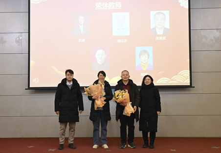 在温馨感人的“一朝沐杏雨,一生念师恩”荣休教师感恩环节,程伟老师、周越老师两位荣休教师步入会场,年轻一代教师为他们献上鲜花,程伟老师代表荣休教师发表深情寄语,回顾了自己的教育生涯,表达了对学院的深厚情感和对年轻教师的殷切期望,让在场的每个人都深深感受到了教育传承的伟大力量,体会到了教育事业的薪火相传、生生不息。