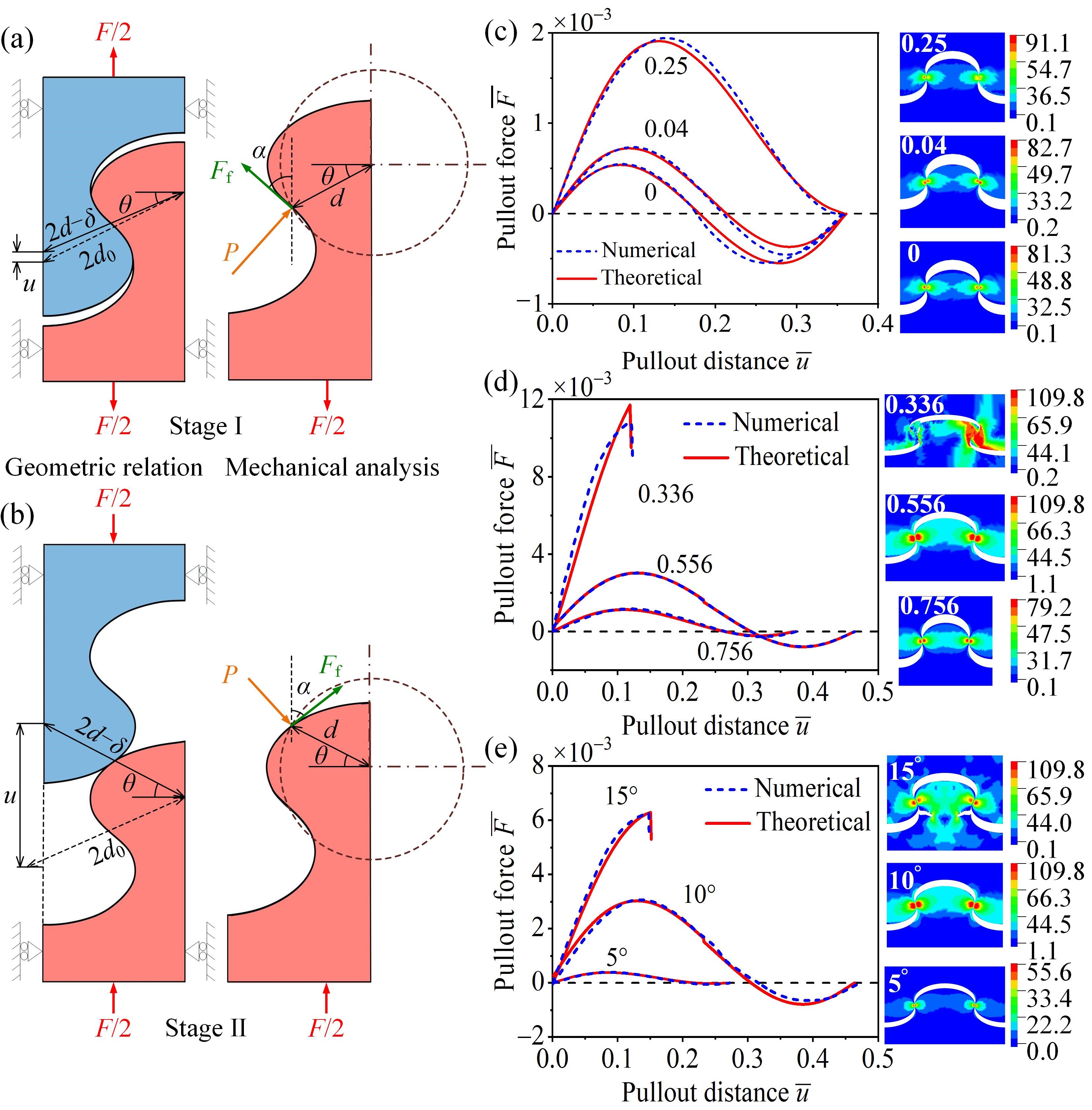 图2 椭圆型骨缝拉拔过程的力学理论分析。(a)阶段I。(b)阶段II。(c)—(e)分别为考虑不同摩擦系数、纵横比和联锁角时的力—位移关系和von Mises应力分布。