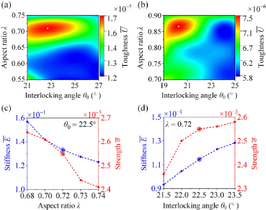 图5 椭圆骨缝的最优化形态。(a)和(b),在不同摩擦系数下,纵横比和联锁角对结构韧性的影响。(c)和(d),在最优纵横比、联锁角附近的结构刚度和强度。