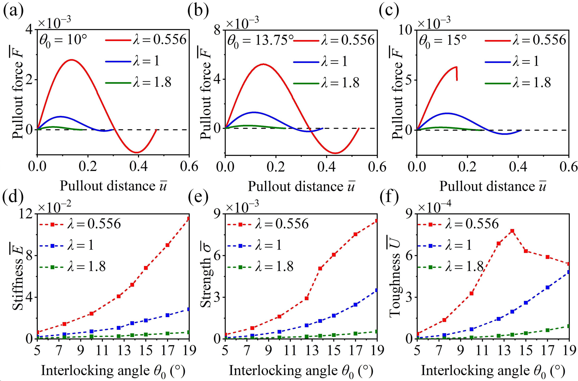 图4 不同椭圆骨缝结构的力学性质。(a)—(c)比较了三类椭圆骨缝的拉拔力学响应。(d)—(f)比较了它们的刚度、强度和韧性。