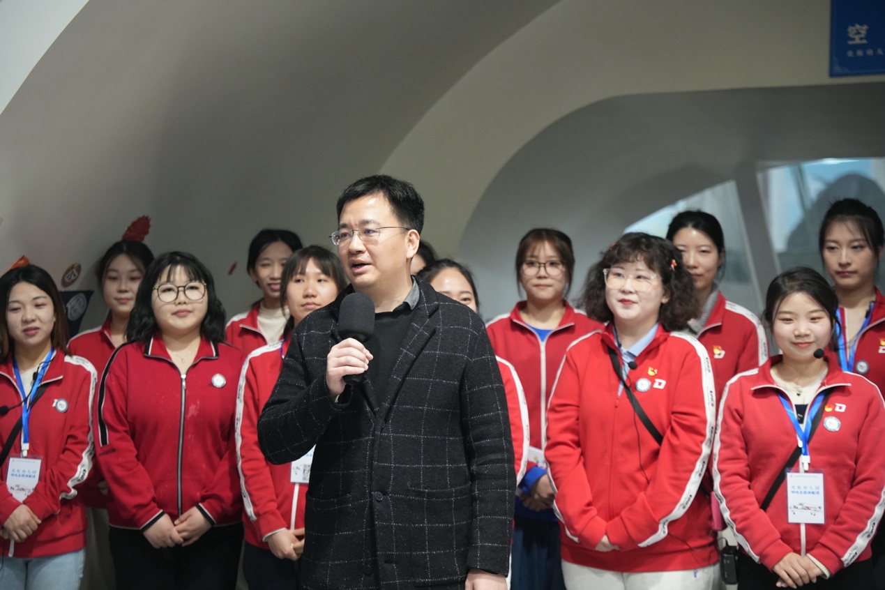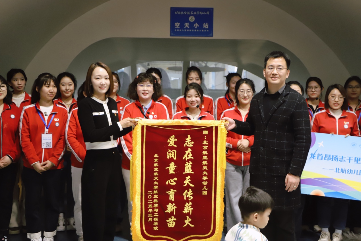 向幼儿园赠送“航天筑梦 幼教同行”锦旗,他表示“空天小站”是服务基础教育的重要载体,与幼儿园的合作是“大-幼”衔接的创新实践,希望它能成为孩子们探索星辰的“第一座发射塔”,让科学的种子在幼小心灵中生根发芽。