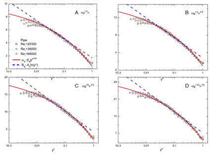 图 2 湍流边界层流向速度脉动的各阶矩分布。(A)2阶矩;(B)4阶矩;(C)6阶矩;(D)10阶矩。蓝色虚线:附着涡模型Eq.1 (Hultmark et al, 2012 PRL);(B)红色实线:有界耗散率理论Eq.2 (Chen & Sreenivasan, 2025 PNAS)。图中符号是圆管湍流的实验数据。
