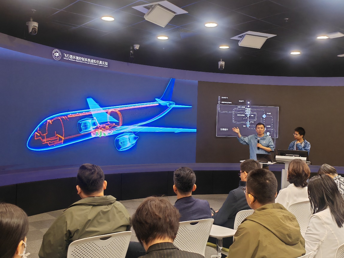 在教学资源展示环节,与会人员参观了北航全景教室,沉浸式感受航空科技的无穷魅力。李可教授展示了虚拟仿真课程及其在航空航天教学中的创新应用,通过沉浸式体验,让学生更好地理解和掌握相关知识和技能。宋磊老师介绍了北航航模队的发展历程和辉煌成就,分享了航模队的课程体系与技术特点,强调其在培养学生航空航天兴趣和实践能力方面的重要作用。
