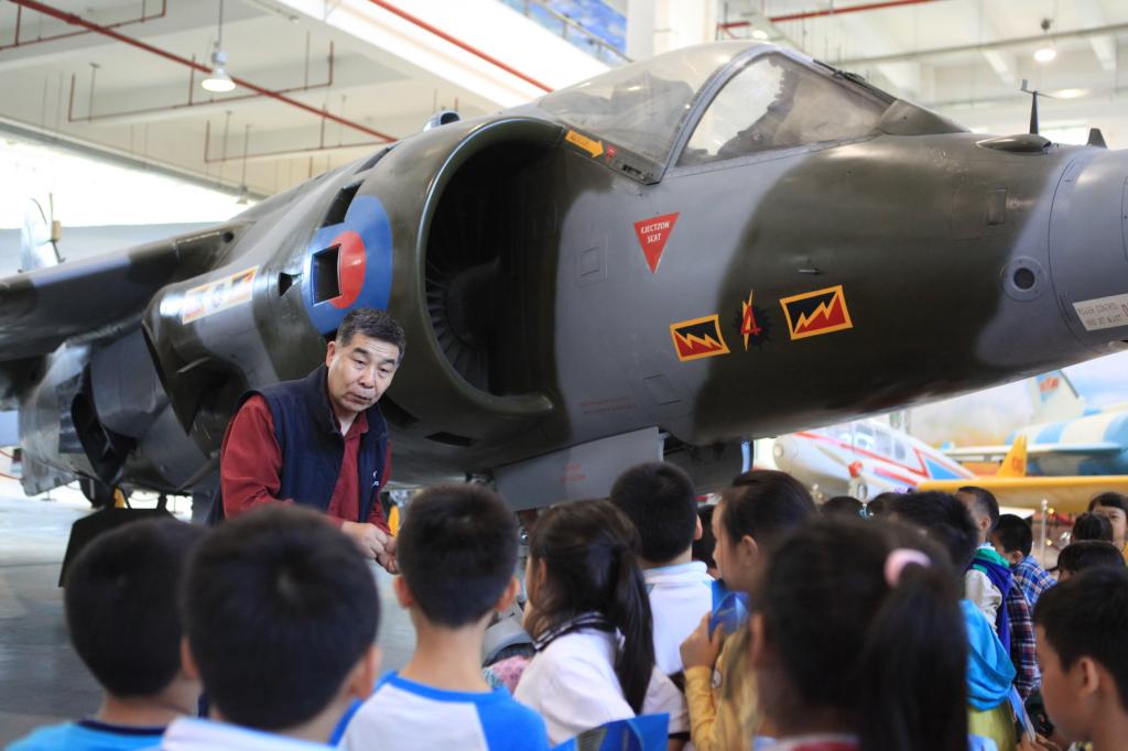 来到北京-1号前,韩馆长深情地对孩子们说,这是北航的师生,是你们的爷爷奶奶辈的北航人,在短短的100天内,自己设计制造的一架轻型旅客机,它从北京飞到了上海、南京。作为一架飞机,它主要由机身、机翼、发动机、起落架、机载设备等几部分组成。而在鹞式战斗机前,韩老师亲自示范,让孩子们看到了这架飞机的特殊性:它的喷气口在腰部,而且可以转动,能够向下喷气,也正因为此,它可以实现垂直起降的功能。