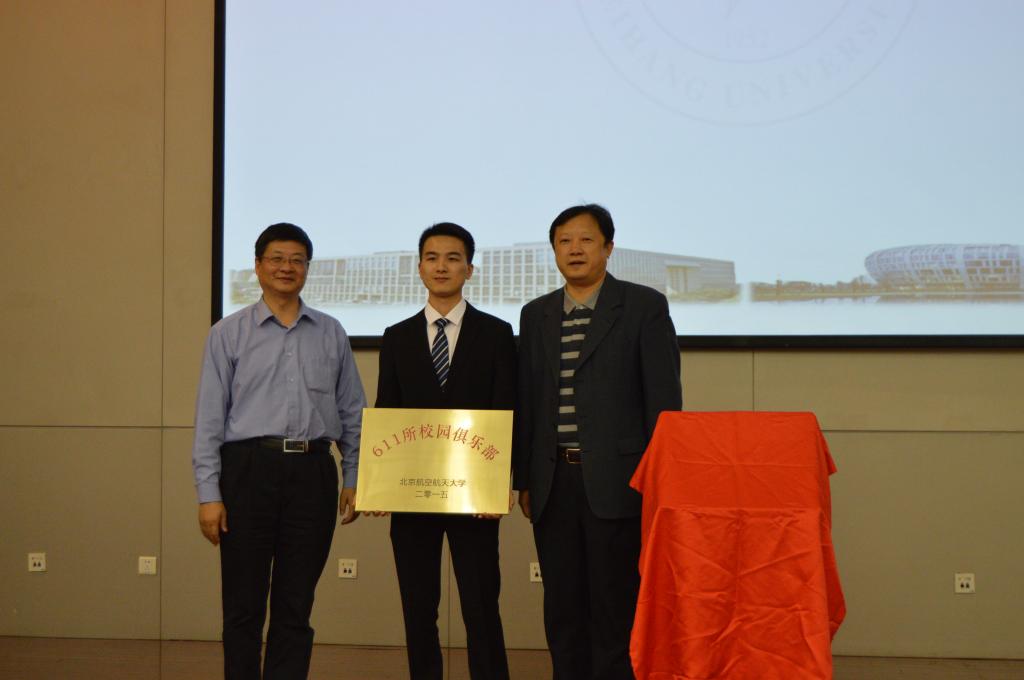 院长杨超教授共同为北航-611所校园俱乐部揭牌,这标志着俱乐部的正式成立。随后蒋平部长和杨超院长共同向北航-611所校园俱乐部第一届会长张璞川同学授牌,并合影留念。
