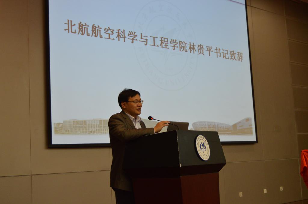 党委书记林贵平教授为北航-611所校园俱乐部的成立致词。在致词中,林书记高度称赞了北航和611所多年来广泛而深入的交流与合作,对即将成立的北航-611所校园俱乐部给予了高度的肯定。他表示在北航和611所的大力支持下,由我校研究生自发创办的北航-611所校园俱乐部今天终将破茧而出,它是校企合作的典型代表,是培养与挖掘综合性高素质、创新性复合型人才的摇篮。同时它也将为更广大的学子提供更多的学术交流与就业机会,也必将为北航和611所之间的交流合作注入新的活力。最后他鼓励同学们积极参加俱乐部,不断提升自我实力,为未来打下更好的基础。