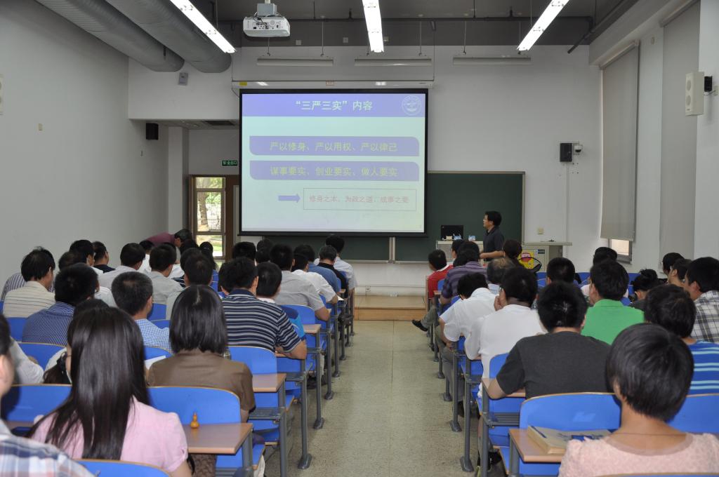 林贵平书记重点从以下四个方面进行了报告:一是结合《中国共产党章程》中对共产党员的定位、要求,历史上历任领导人对党的建设的重视和传统文化精神对“三严三实”精神的阐述,以及现实需要等方面介绍了“三严三实”提出的背景,同时介绍了“三严三实”活动的重大意义。接着,重点讲述了“三严三实”的丰富内涵。三是,针对学院班子工作提出了4个在不严不实方面存在的问题,最后,结合存在的问题,提出了如何结合学院综合改革,深入践行“三严三实”。
