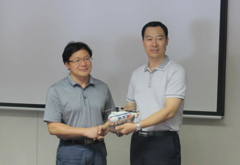 书记林贵平向联合动力党委书记褚景春赠送北航海鸥无人直升机模型