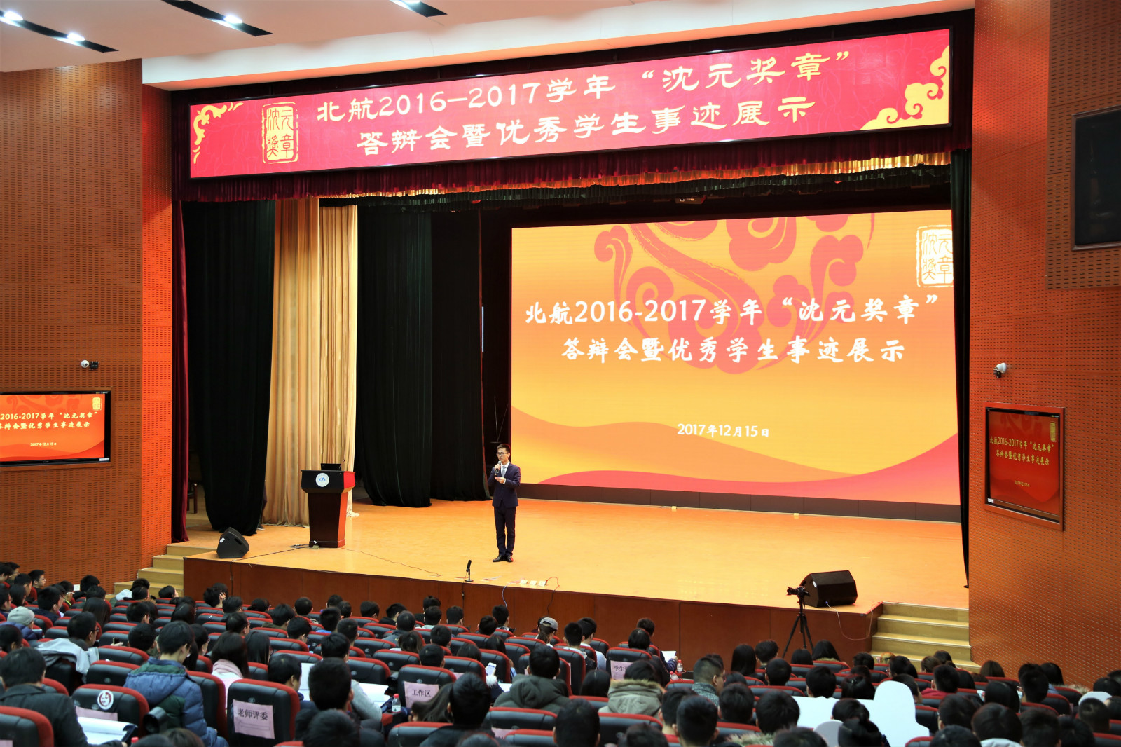 12月15日下午,北航本科生最高荣誉“沈元奖章”评审答辩会在沙河校区咏曼剧场举行。副校长黄海军,校党委副书记李军锋,校学术委员会副主任杨嘉陵,我校校友北京日报社国内国际部副主任曹斌,北京大学学生工作部副部长樊志,北京理工大学学生工作部副部长徐贵宝,校机关部处、教学督导组、北航学院(书院)、以及25个学院的教师出席了评审会并担任老师评委。同时,本次“沈元奖章”评审委员会还邀请了50名学生代表担任学生评委。