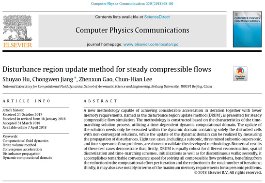 我校李椿萱院士团队的博士生胡姝瑶和蒋崇文副教授、高振勋副教授在物理数学领域排名第一的国际顶级期刊《Computer Physics Communications》上发表题为《Disturbance region update method for steady compressible flows》的学术论文。该文章是我校国产做爱视频