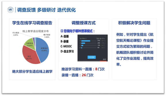 线上教学情况调查表》,数据报告显示,绝大部分同学能够适应线上教学。针对学生提出的问题,分门别类进行解决,例如,根据教学督导组及学生反馈的直播方式更受学生欢迎的情况,针对性微调部分课程的授课方式,增加了直播的课程门次。