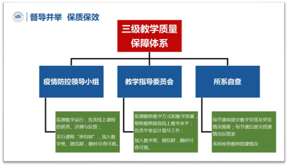 积极开展教学监督和指导工作,建立三级教学督导保障体系,从学院、教指委、系所三个层面保证教学工作在有序开展的前提下保质保效。监督方面,学院成立了疫情领导小组,采用“承包制”模式开展网上教学的巡查工作,监测教学运行情况;指导方面,学院教学指导委员会委员进入每门课程的线上课堂,跟听课程并在课后对教师进行指导,提升教学质量;此外,系所在课前及课后对教师的课程安排及授课情况进行把关,确保每门课程的质量和效果。