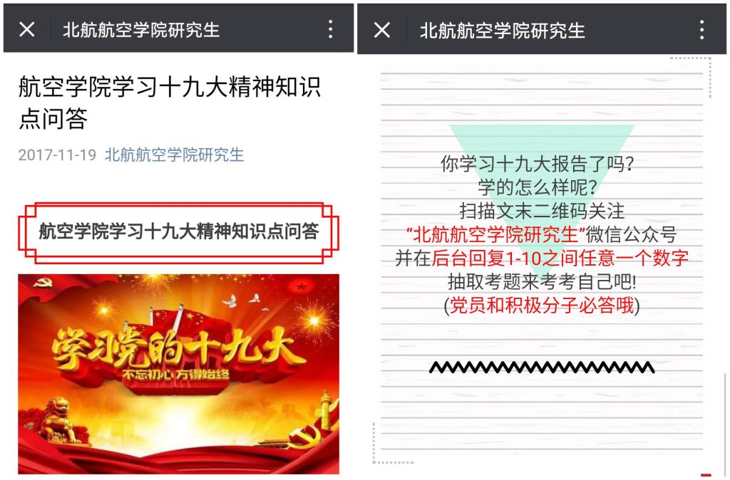 研究生党支部积极总结和推广创新型学习形式,各支部积极举办分享座谈会,航院社团自发、主动策划的“新时代、新青年、新征程”学习十九大精神座谈会被“北京支部生活”微信公众号报道。学习十九大精神不仅要全心全意入脑入心,还要落地生效。学院全体师生需要在党的十九大精神指引下,不忘初心,牢记使命,始终保持昂扬的奋斗精神,为实现中华民族伟大复兴贡献自己的力量。