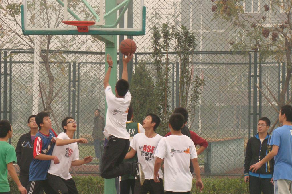 女生篮球赛结束不久,接着就是新生男子篮球表演赛。球员分别由各班在之前于新生篮球赛发挥出色的球员组成。比赛采取上下半场各20分钟,期间无暂停,5对5全场的方式。为了是比赛节奏更快一些,气氛更活跃一些,充分展示每个上场球员的特长,很好的诠释了“表演赛”这三个字。比赛一开始,双方队员就开始了积极拼抢,可随着比赛的深入以及场下观众对比赛观赏性的需求,双方逐渐开始了对攻战。后场长传,前场跑位上篮一气呵成,。最终,比分停格在64:63。