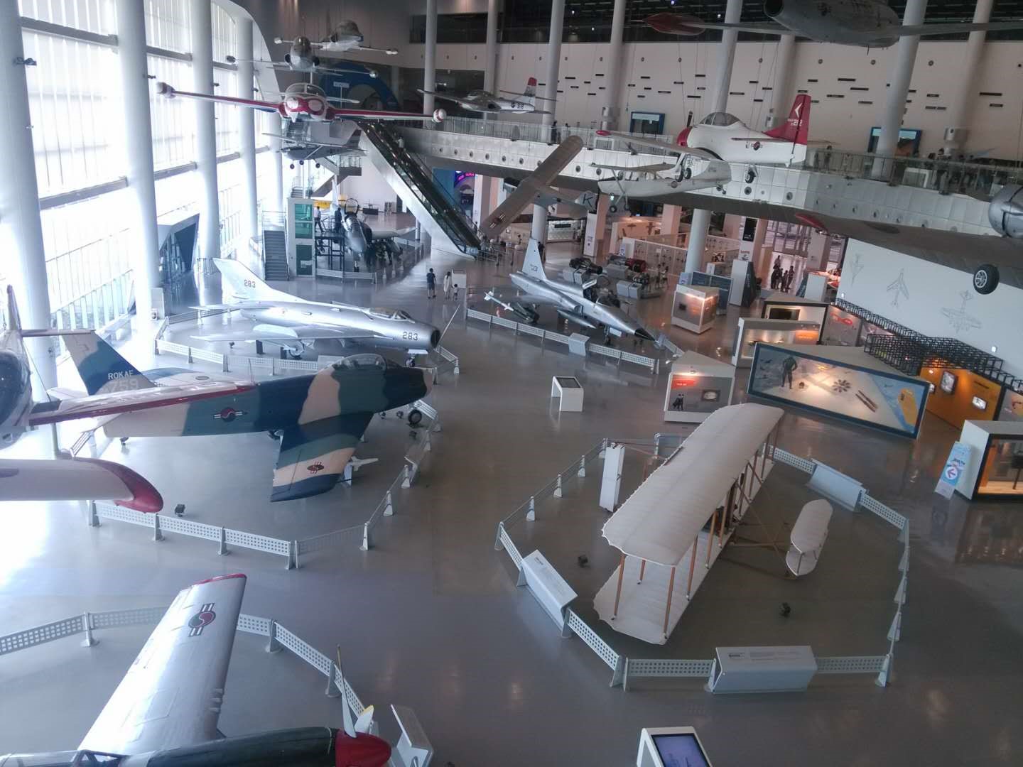 整个航空馆陈列室尽收眼底,除了停机坪上的机型,米格-17、米格-19、F-5、莱特兄弟飞行者1号仿制模型俨然成了镇馆之宝。