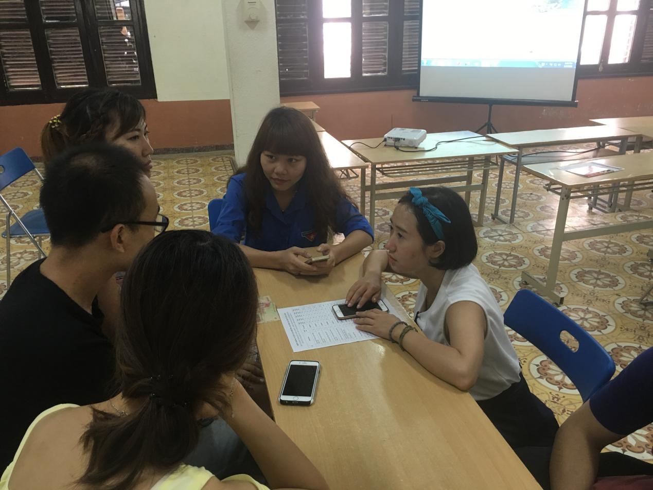 越南时间14:30,游学团与国立河内大学中文系同学在学校活动中心就校园文化、学生社团工作以及越南轻工业现状等方面的问题进行了讨论交流。交流中,首先由国立河内大学中文系阮进达同学介绍了国立河内大学概况,阮进达同学介绍了国立河内大学的历史沿革、专业设置以及特色活动;随后游学团领队蒋都辉同学介绍了国产做爱视频