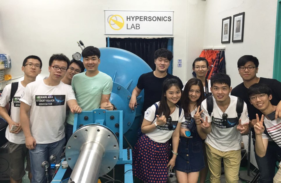 同时,KAIST-AIAA学生分会还安排队员们参观KAIST航模队基地以及各种重点实验室。其中,Seungchan Hong博士等人为队员们介绍了光-电-结构一体化实验室的主要研究课题,详细讲述了无人机智能机翼触觉端口技术、基于FPGA的超声传播成像探伤技术,以及无线超声传播成像用于远程扫描探测结构损伤系统;队员们还参观了空天系统与控制实验室,Seongheon Lee博士介绍了该实验室智能无人机路线规划、导航与制导的技术。Seongheon LEE博士则带队员们参观了高超声速实验室,并详细介绍了产生高超声速气流的实验装置。尖端一流的实验设备,近距离的仪器演示操作,以及博士们细致生动的讲解,使队员们收获颇丰。