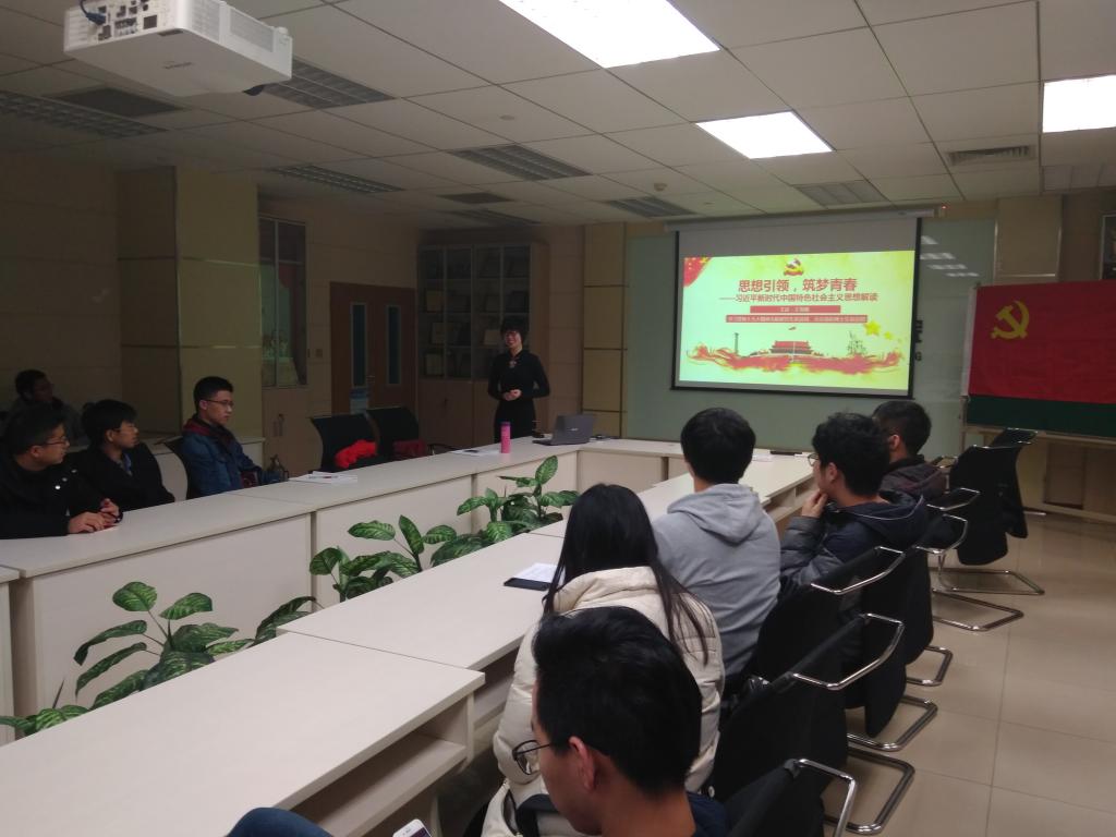 新主楼C708房间听取学习了十九大精神北航研究生宣讲团系列活动报告,来自北京高校博士生宣讲团、学习贯彻十九大精神北航研究生宣讲团的王雪晴讲师为参会的党员们作了题为“思想引领,筑梦青春——习近平新时代中国特色社会主义思想解读”的报告。