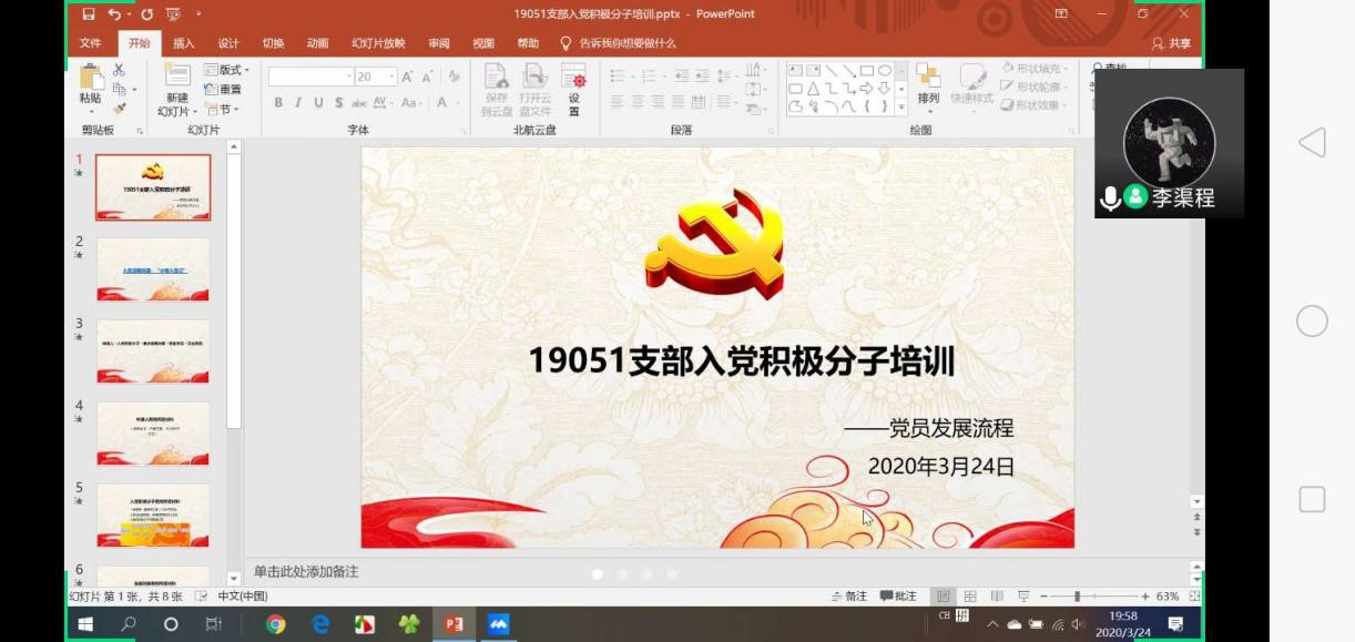 在集中学习讨论之后,由支部组织委员李渠程同志主持,支部进行了积极分子入党前的培训工作。全体积极分子共同观看了动漫《小明入党记》,进一步了解入党的规范流程;随后,李渠程同志为大家详细讲解了培养考察要求、入党前需要整理的材料以及党员发展流程中的重点注意事项;另外,对近期可进行发展答辩的两位积极分子,提醒他们认真准备并及时提交相关材料,积极准备发展答辩。