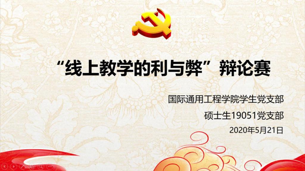 根据“教学相长 携手共进——本研结合的师生良性互动模式探索”党创基金活动项目规划,硕士19051学生党支部与国际通用工程学院学生党支部于5月21日20:00开展共建活动,以“线上教学究竟利大于弊,还是弊大于利”为题开展辩论活动。来自两名支部的六名辩手参加了本次辩论,国际通用工程学院学生党支部书记孙博扬和硕士19051党支部书记马英超担任评委。