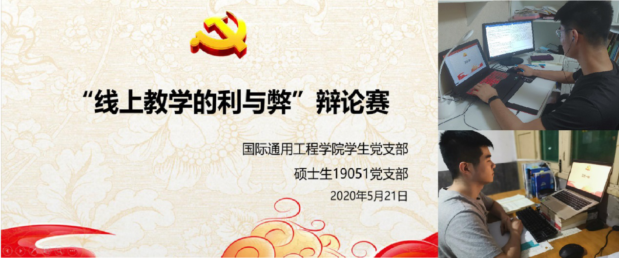 5月21日,硕士生19051学生党支部与国际通用工程学院学生党支部以“线上教学究竟利大于弊,还是弊大于利”为题联合开展线上辩论活动,来自两支部的六名辩手参加了本次辩论。