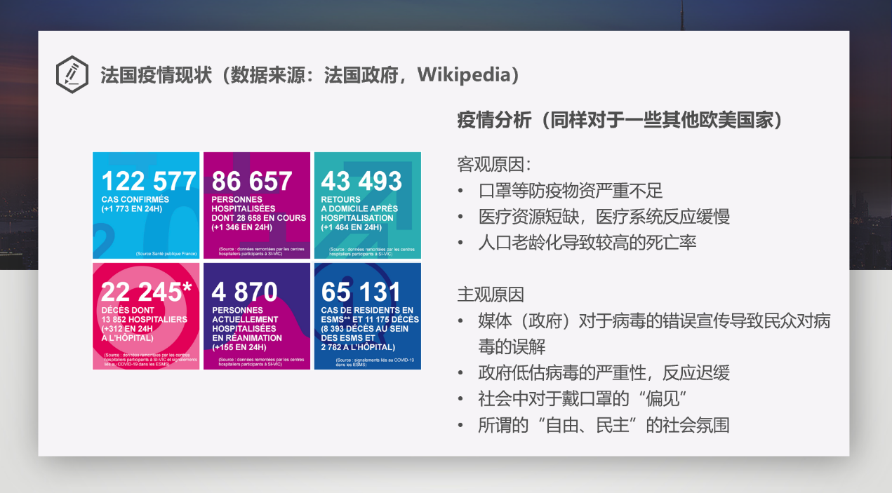 之后,正在法国巴黎交换学习的中法工程师学院2019级研究生党支部党员王泽远同志为大家介绍了法国疫情现状及防控措施。他以一个中国留学生的视角,为大家讲述了自己在巴黎疫情期间的生活状态,使大家更加全面地了解了法国疫情期间的公共卫生、出行交通、防疫物资、学校现状以及日常生活等方面的情况。王泽远同志对比了法国和中国的封城措施,从客观和主观两个方面分析了法国政府没有很好地把握住中国为世界抗疫创造的窗口期而导致感染人数激增的原因。最后,王泽远同志与大家分享了自己对疫情背后中法关系的看法,向大家讲述了自己遭受个别法国民众的人身攻击的经历。