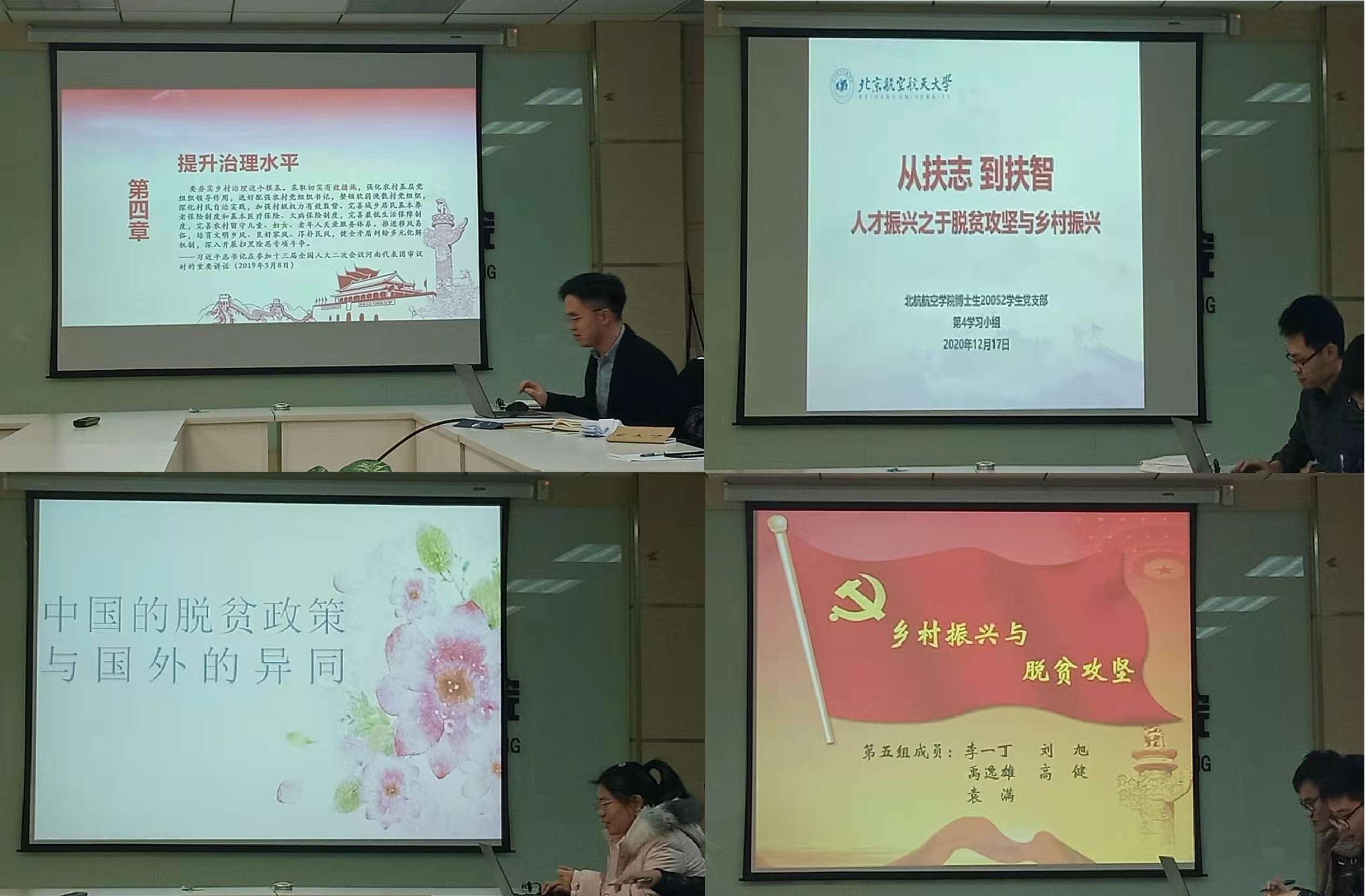 12月23日,支部以访谈交流会的形式联系北航定点扶贫单位——山西省中阳县阳坡村党支部,采用线上会议的形式,与北航驻中阳县扶贫干部、阳坡村第一书记韩庚进行交流学习,韩庚书记向我们介绍了在脱贫扶贫过程中传承的“带不走”信念,以及包含“平等、诚信、创新、吃苦、共享”的“北航砣砣”精神。我们了解了他们在实际工作中遇到的问题,学习了当地脱贫的成功经验与教训,并且对想要了解和探究的问题同韩庚书记进行讨论。在同韩庚书记交流的过程中,各位党员同志意识到“理论联系实际”的重要性,认识到基层工作的复杂性与实践性。