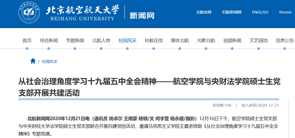 马克思主义学院王晨老师担任主讲人。王老师通过多重维度,运用多种方法为各个支部、不同专业同学提供了理解会议精神的全新视角,促进了思维交汇。在课程讨论的过程中,两校同学加强了支部党员交流,增进了共建互联友谊。该活动分别在北航新闻网和央财法学院官网上进行了报道。