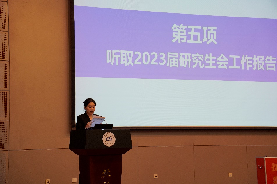2023届研究生会主席团成员李金瑛宣读我院第四次研究生代表大会代表资格审查报告,并征询了与会代表的意见。
