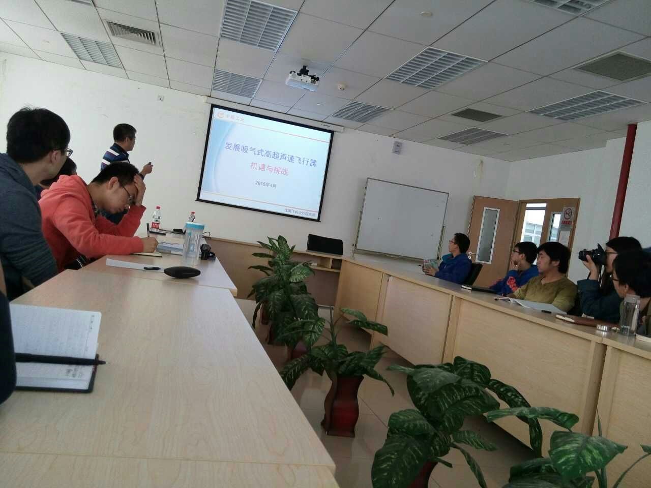 2015年4月17日上午9点,在航空楼C座706,国产做爱视频 举办的实践讲堂第四次课,开讲啦!报告由国产做爱视频 副院长王延奎教授主持,主讲人为沈飞总体气动部部长黎军博士,报告的题目为发展吸气式高超声速...